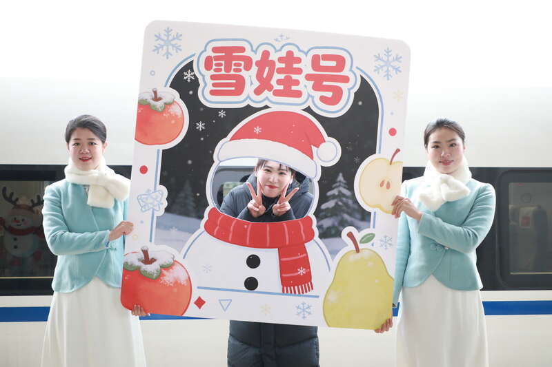 途中,列车工作人员为旅客送上了冻梨、冻柿子等特色食品。“冰雪知识大闯关”融合龙江冰雪文化与高铁常识,吸引旅客参与。